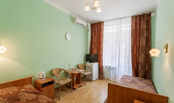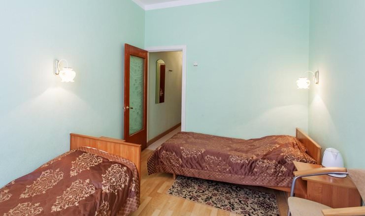 Номер для двоих с односпальными кроватями расположен в первом корпусе. Его площадь составляет 12-15 кв.м.